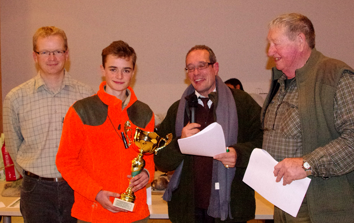 Thibault Bauvais, notre junior, malgré un mauvais tirage au sort de passage (dernier de sa catégorie) et les trois premiers chiens qui font voler un nombre important de faisans, enlevant ainsi pratiquement toute chance aux derniers concurrents, contraints de chasser sur un terrain « vide » (en régionale, tous les faisans sont posés le matin en une seule fois), force la chance. Son jeune setter lui arrête un lapin qu’il tue proprement. C’est le seul prélèvement dans ce concours et au final c’est un titre de champion qui vient très logiquement récompenser Thibault. A noter son score de 80 points et la marge de 18,5 points qui le sépare du second.